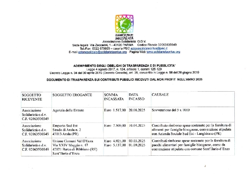 DOCUMENTO DI TRASPARENZA SUI CONTRIBUTI PUBBLICI RICEVUTI DAL NON PROFIT NELL'ANNO 2023